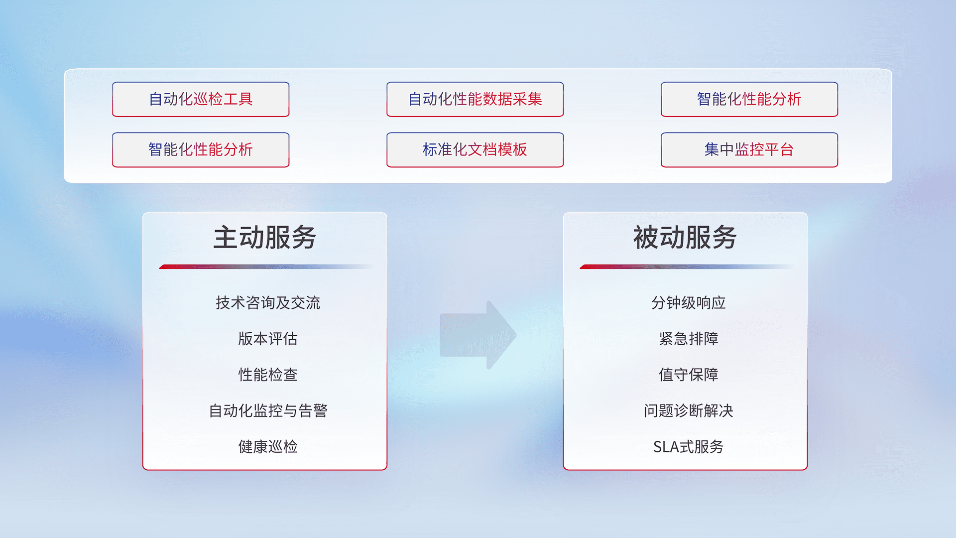 智能化工具和标准化文档,,,保障服务质量,,,提供主动服务(包含技术咨询、、、、版本评估、、、、性能检查、、、自动化监控与告警、、、健康巡检)和被动服务包含(分钟级响应、、紧急排障、、值守保障、、问题诊断解决、、、SLA服务)。。